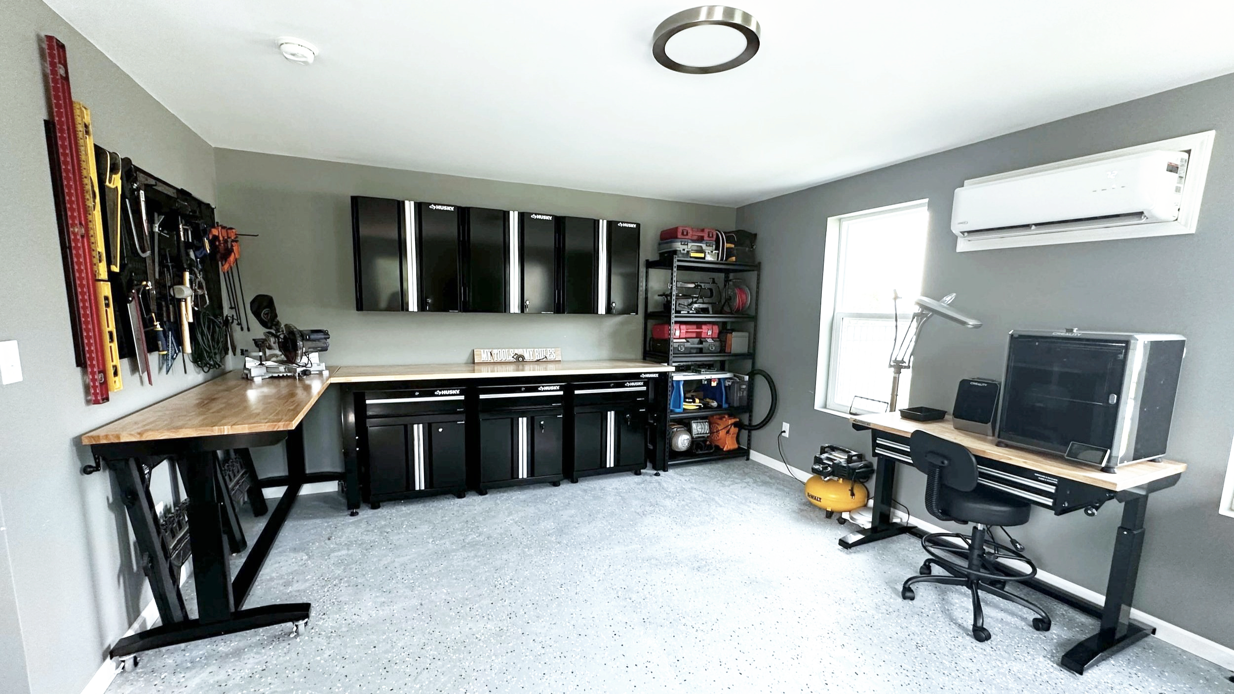 To maximize the workshop, we measured the space and designed a layout that included work tables in various sizes and durable metal cabinetry. A fixed 3D printing station and a mobile worktable would give the family both structure and flexibility to move things around for future projects.